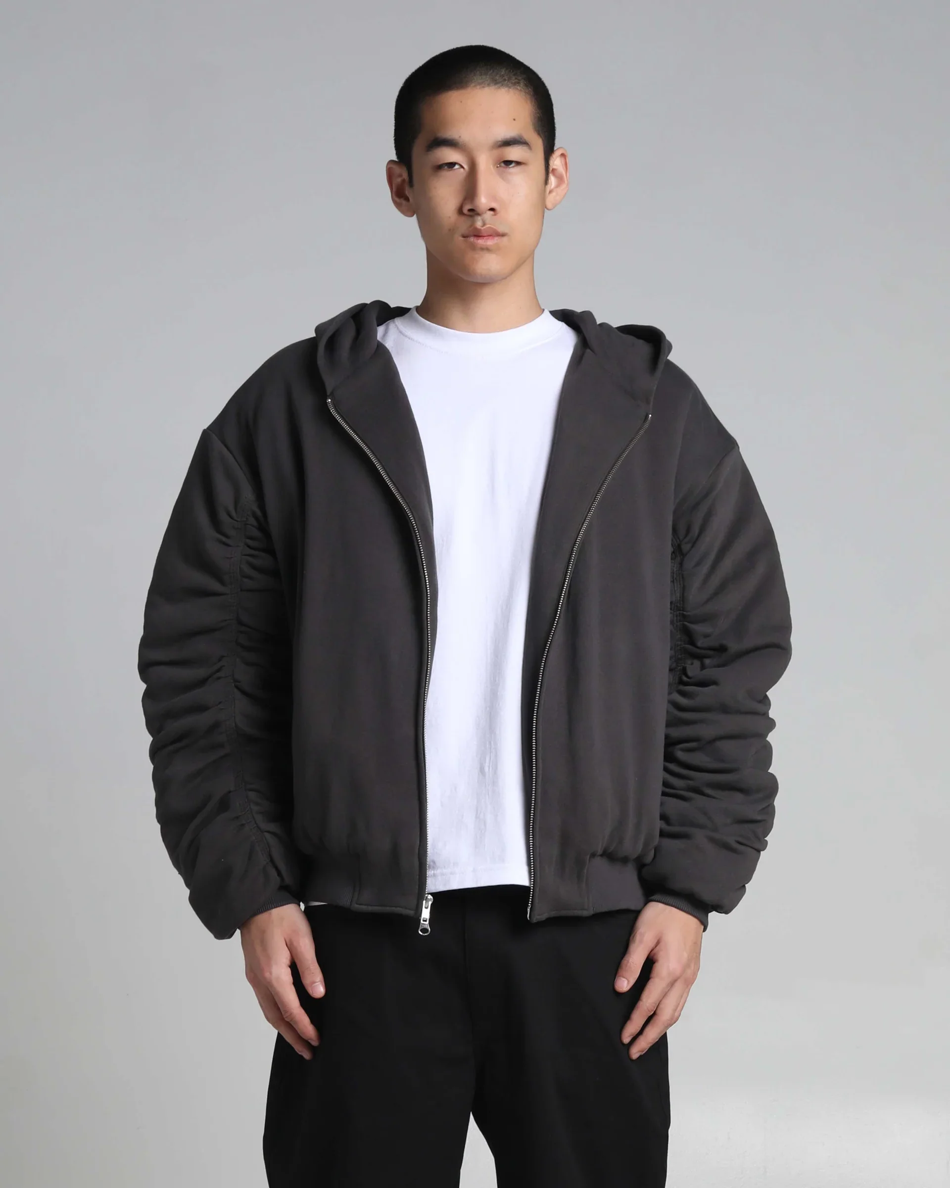 Additional details include a YKK zipper, shirred sleeves, and elastic cuffs.
